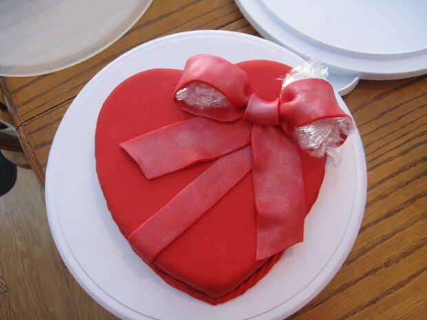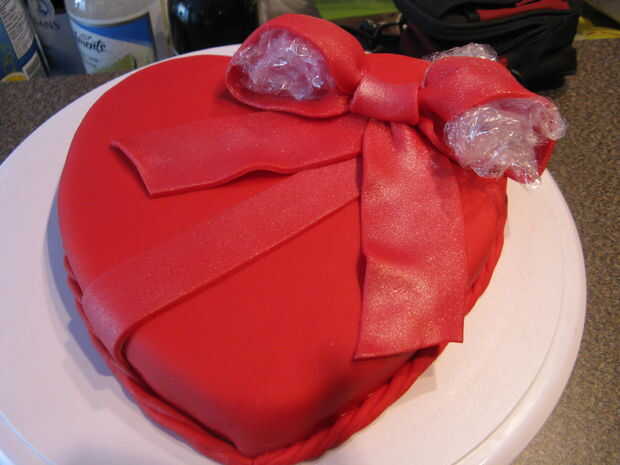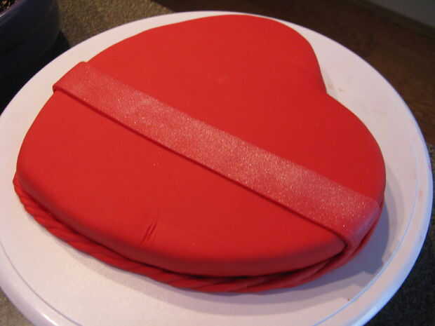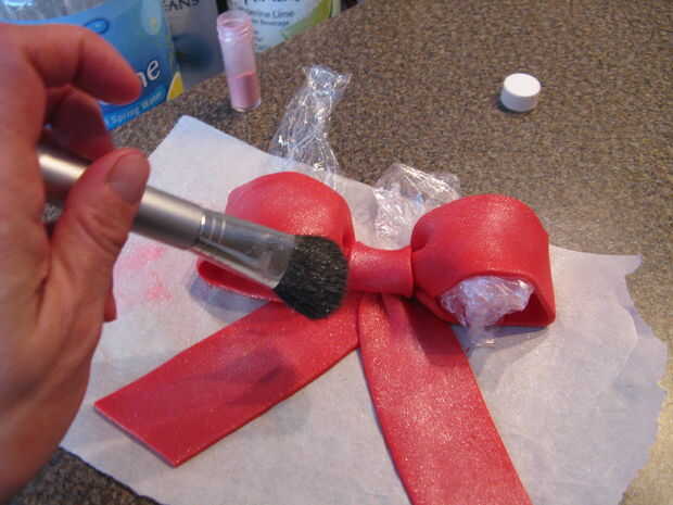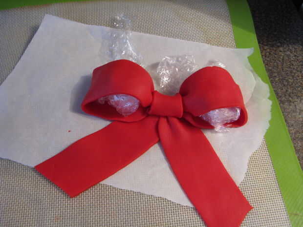 Hacer el nudo de centro con otro trozo de fondant, rodado y marcado de la misma manera que las otras piezas, pero sólo hacer a 1/2 la longitud de las piezas de la cola. El nudo es simplemente una tira corta (tal vez 1' por 1") y sólo está envuelto alrededor de todos los extremos arrugados encima así que no hay codigo postal los bordes ásperos que muestra. No es necesario ir todo el camino alrededor de la parte posterior del arco, sólo meter los bordes bajo para que no vean.