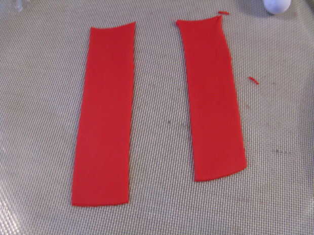 Cortar dos tiras del fondant (o pastillaje) la misma longitud y anchura. Éstos forman los bucles. Generalmente corto mío alrededor de 7,5 cm/3 pulgadas de ancho y de 15 cm/6 pulgadas de largo. La longitud de estos lazos determinará el tamaño del arco usted, así que si quieres un arco de 10cms/4 pulgadas largo los lazos necesitará ser un poco más del doble que la longitud cuando se cortan. Su un poco de ensayo y error, pero la longitud puede ajustarse después de que ' ve sido cortar muy fácilmente.