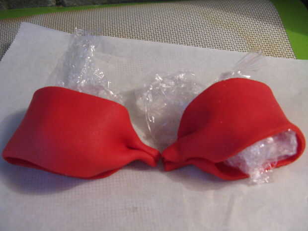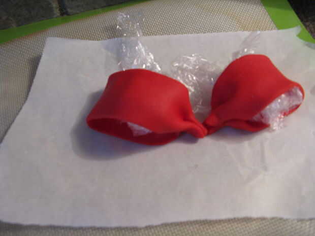 Entregar un pedazo de lazo y pellizque los extremos juntos, luego hacer lo mismo con el otro extremo y pellizcar los dos extremos juntos. Ponga un abrigo de saran en las piezas de proa para establecer en su lugar.