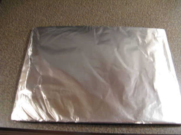Opcional: línea de la torta del tablero con papel de aluminio y alimentos seguro plástico para envolver (esto no es necesario pero hace más fácil limpiar la suciedad fuera del tablero) generalmente uso neutro o plata papel de regalo comprar en Michael, pero habíamos agotado.