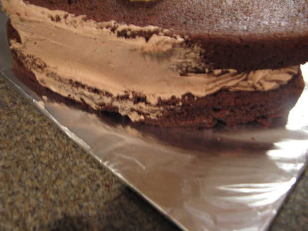 Poner la torta de abajo en el tablero de la torta rectangular principal. Rellenar la tarta inferior con el relleno de su elección (esto es opcional). La torta, asegurándose de llenar en el área donde fue cortado el pastel para llenar, si usted lleno de hielo. Esto no tiene que ser una capa espesa que cubre todo, sólo una capa de migas. Si mezclan unas pocas migajas, no es gran cosa. Suave como el mejor posible.