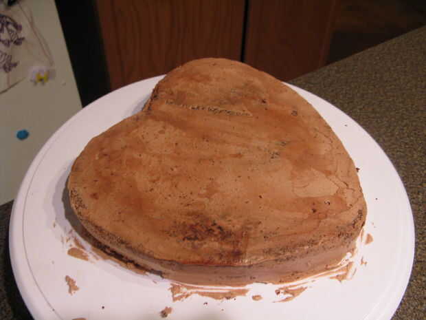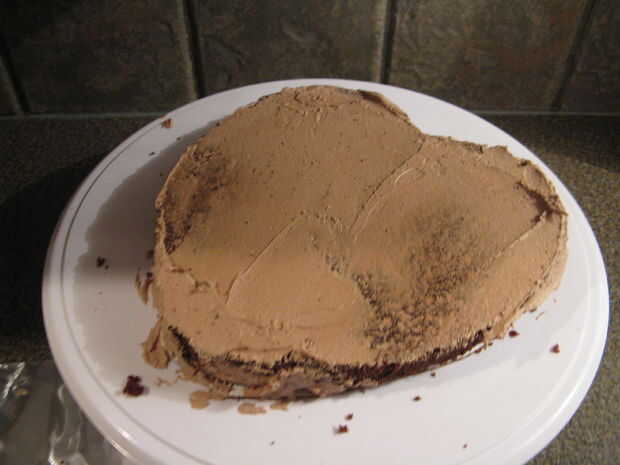 Consejo: Tomar una espátula de metal, sumergirlo en agua hirviendo (yo uso una olla en la estufa) y limpie el agua apagado en un paño limpio y suave la guinda con la espátula caliente seco sobre la superficie de la torta. Quite exceso guinda de espátula. Repetir hasta que el pastel quede lisa