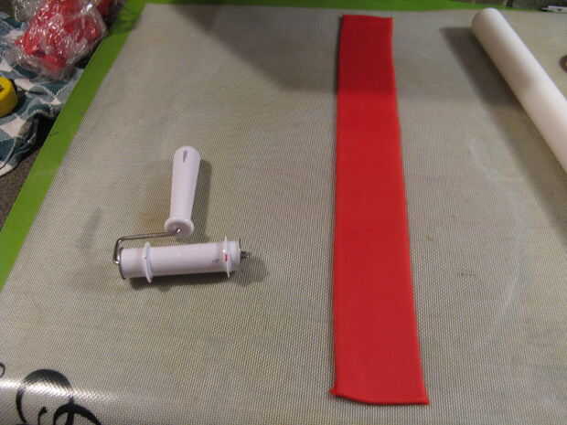 Con cuidado coloque la tira (es probable que necesite 2) alrededor de la torta y cerrar la costura en la espalda con un poco de agua.