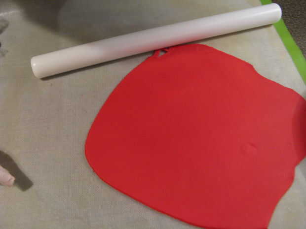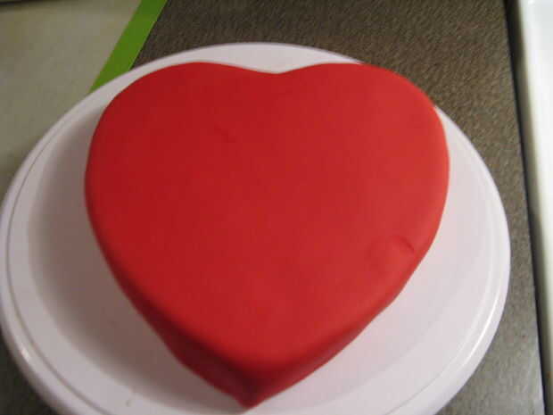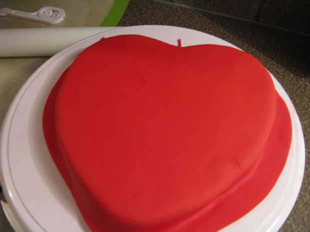 Rodillo pastillaje (fondant) color (1/8" de espesor) y cubrir la parte superior de la torta. Yo generalmente solo calibre cuánto necesito al observarlo. Pero se puede saber aproximadamente cuánto que necesitará ser el pastel a través de la medición y añadiendo un par de pulgadas todo alrededor. Puede cortar la parte sobrante y reutilizar. Si no tienes idea cómo alisar el fondant en un pastel, google-hay un montón de tutoriales. Algunos prefieren un más suave, pero yo uso mis manos (boda anillo!)