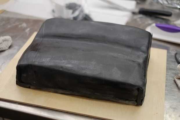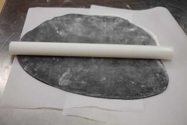- Mezcle una libra de fondant negro con sobre un tercer blanco para hacer un gris oscuro que será la principal superficie de plástico de la tapa armónica.