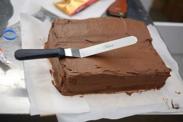 Capa de sus tortas con un extensión de sobre una taza de ganache. Por esta razón hicimos tanto ganache. Es más difícil ser tacaño con él. Una espátula offset reglas para este trabajo. Es difícil que incluso sin él, pero incluso un cuchillo de mantequilla hará con paciencia.