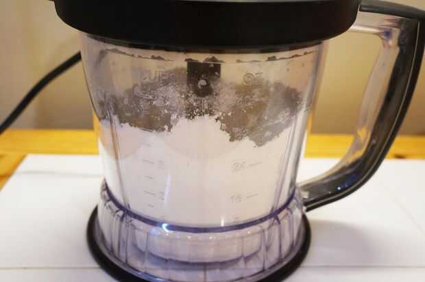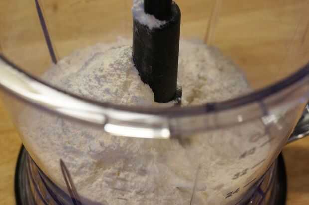 Añadir harina de azúcar, la sal y el polvo para hornear para el procesador de alimentos y el pulso para mezclar.