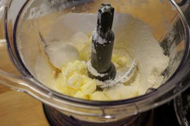 Añadir la mitad de la mantequilla muy fría y manteca para el procesador y el impulso para formar una mezcla arenosa.