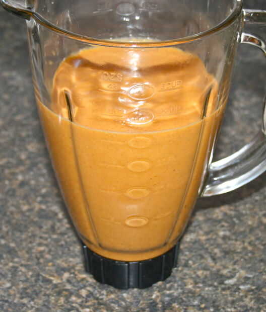 Agregar 1/2 taza de leche de coco y 3 huevos a la licuadora.