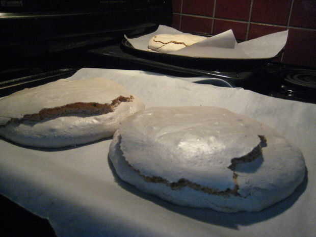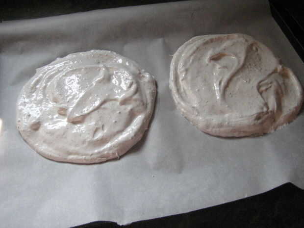 5. usando una espátula, extender 1/3 de merengue sobre cada círculo de pergamino.