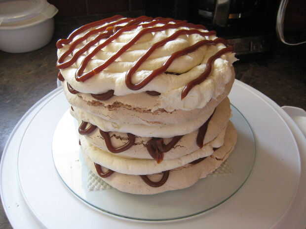 Básicamente poner caramelo de tubería en cada merengue y tubo de crema. terminar con una capa extra de caramelo en la parte superior.