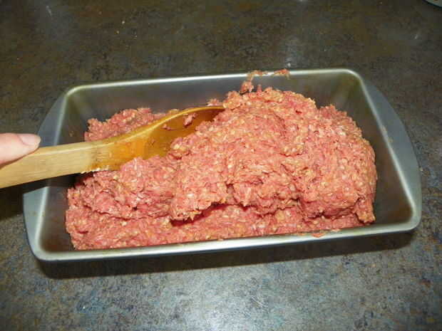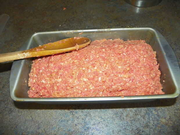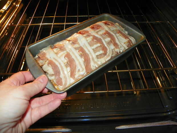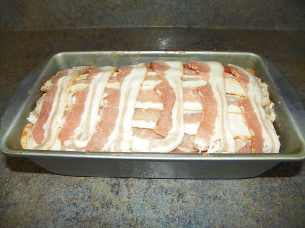 Coloque la mezcla de hamburguesa en un pan de pan de 9 x 5, pulse hacia abajo con el dorso de una cuchara, cubrir con las tiras de tocino. Coloque en un horno de 350 grados durante 1 hora.