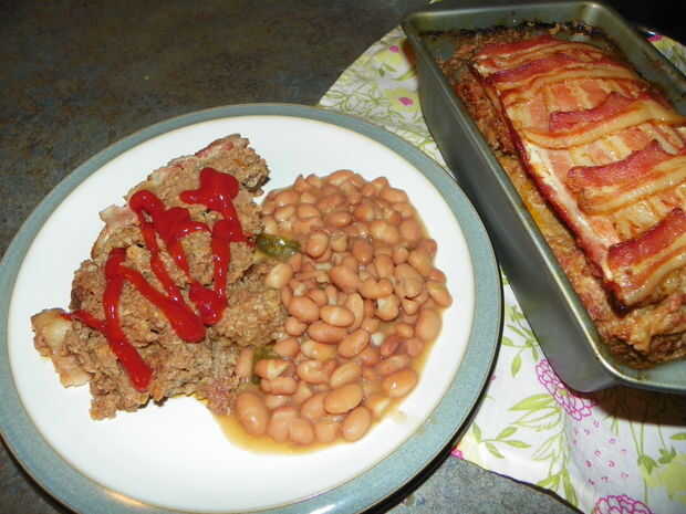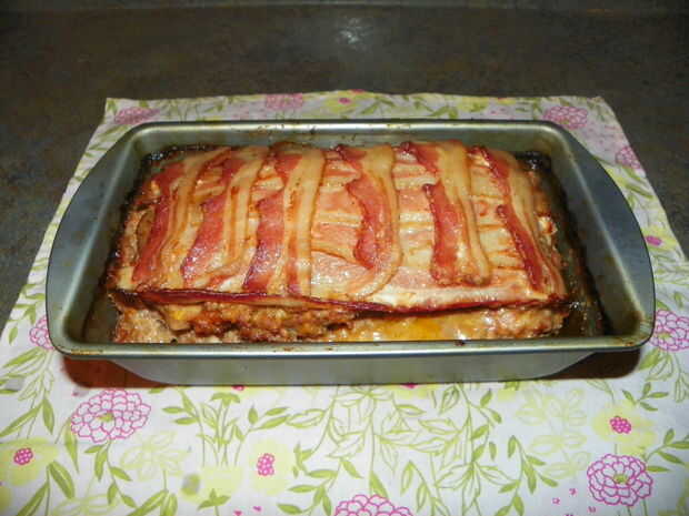 Causa a veces la comida es la mejor!Ingrediente:500 g (1 libra) de carne molida2 huevospicadas de perejil1/4 taza de queso parmesanosalpimienta negra3 rebanadas de pan blancoBacon1/4 taza salsa de tomate2 cucharadas de mostaza2 cucharadas de azúcar m