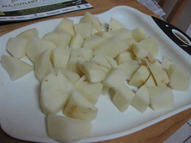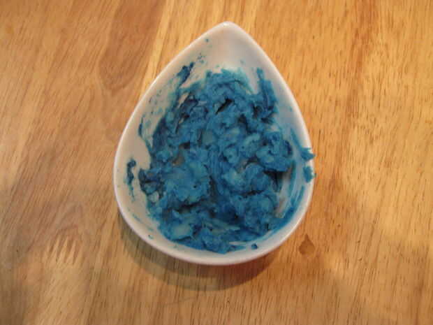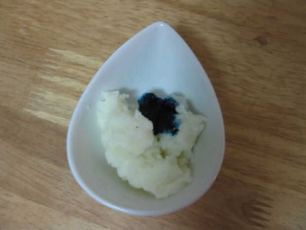 Una vez que haya terminado, añadir unas gotas de colorante a las patatas. Homogeneizar el color.