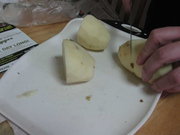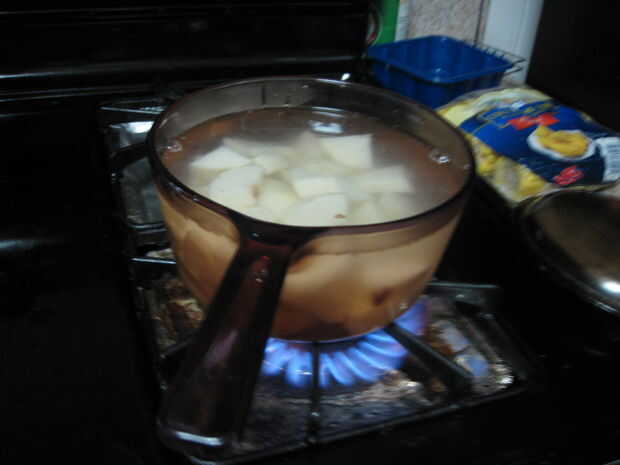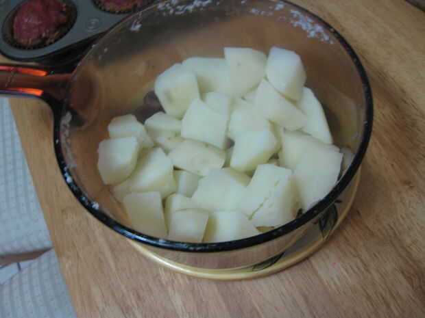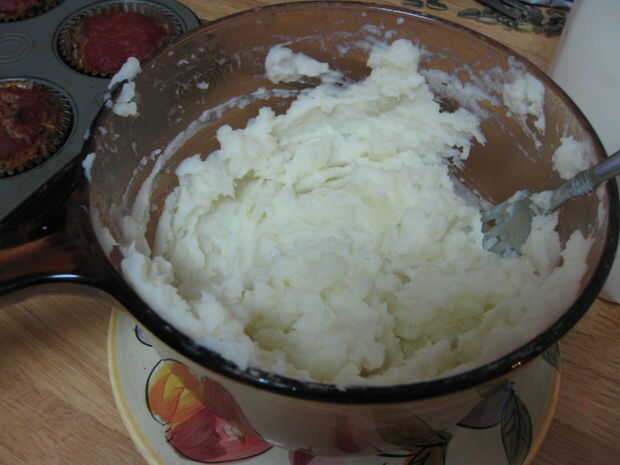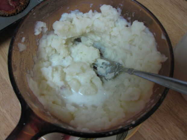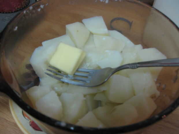 Poner las patatas cocidas en un bol y añadir la mantequilla y la leche. Puré con un tenedor hasta tener una consistencia suave. Agregar la leche a lo largo de la manera de hacer las patatas suave.