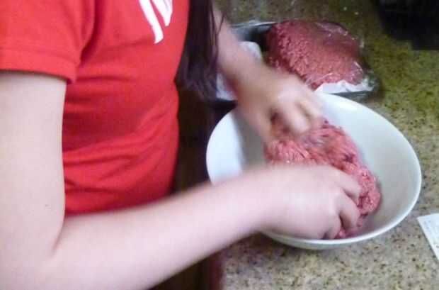 En primer lugar, en un tazón grande, romper la carne molida con las manos. También se puede utilizar tierra pollo, pavo o cerdo.