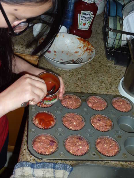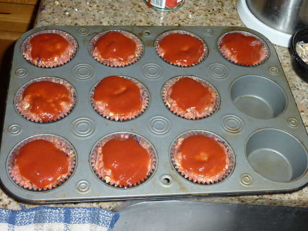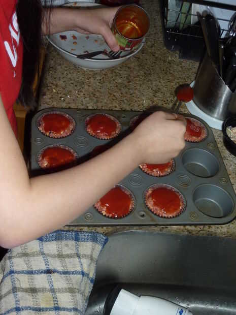 Finalmente, verter parte de la pasta de tomate encima de cada cupcake de pan de carne.