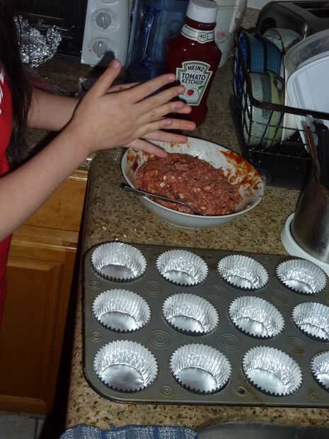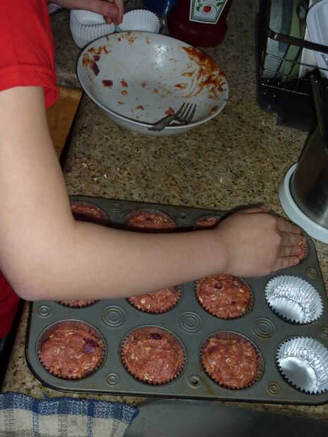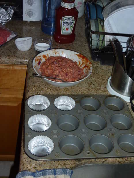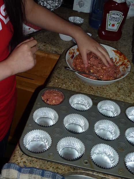 Colocar cada bola de pastel de carne en los trazadores de líneas de la Magdalena. Asegúrese de que aplanar la parte superior de los cupcakes de pastel de carne.