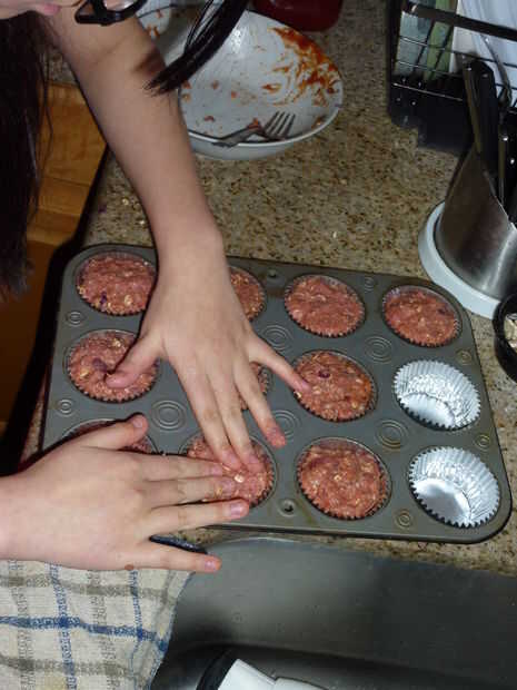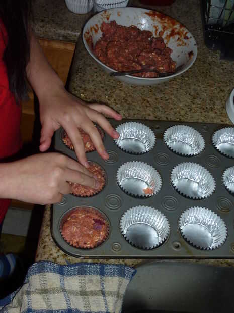 Use sus manos a las bolas de forma con la carne molida. Las bolas deben ser por el tamaño de la lata de la Magdalena y deben encajar en los trazadores de líneas de la Magdalena. Llenar sólo en el borde de los trazadores de líneas de Magdalena funcionado bastante bien.