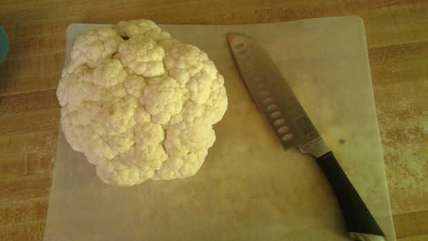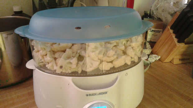 Tenía una cabeza de coliflor necesitaba usar, pero realmente cualquier cosa usted podría vapor y luego puré de puré debería funcionar bien. Quería asegurar que mi puré fue bastante suave así que añadido 2 minutos el tiempo de vapor recomendada del libro que vino con mi vaporera. He añadido una pizca de sal y un poco del agua de mar en la bandeja vaporera a la licuadora cuando me puré.