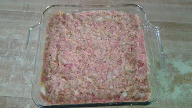 Como digo, debe ser capaz de usar cualquier receta de pastel de carne que te gusta, siempre y cuando se puede cocinar en forma de pastel. Generalmente uso esta receta de Allrecipes.com como mi receta base. Mi gran diferencia es generalmente ronda hasta 2 libras de carne molida, y a veces añadir queso a la mezcla. En el caso de este pastel, se omite la mezcla de salsa de tomate para que sea más fácil aplicar la coliflor y en lugar de otro agrega un poco de salsa de tomate y rábano picante a la mezcla de carne de un sabor extra.