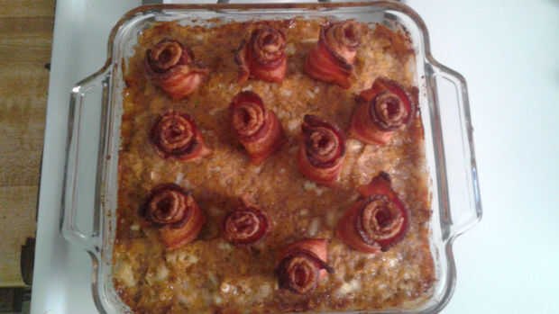 Ahora, cuando miré mis rosas fríos no estaba seguro que habían cocinado a través en 40 minutos, así cuando el pastel de carne era cerca de 2/3 el hecho que llevó a cabo y establecer las rosas en la parte superior. Me imagino a aumentar el grado de cocción de las rosas y añadir un golpe de sabor y humedad a la parte superior del pastel de carne como que termine de cocinar.