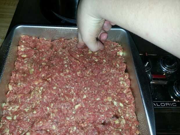 Me gusta saturar completamente mi pastel de carne con la salsa que puse en la parte superior. Así que para preparar para eso, utilice un dedo y meter un montón de agujeros en la parte superior del pastel de carne. Luego dejar esto de lado y la cabeza a la siguiente cámara de prueba.