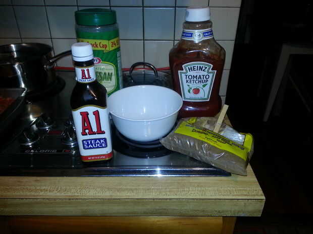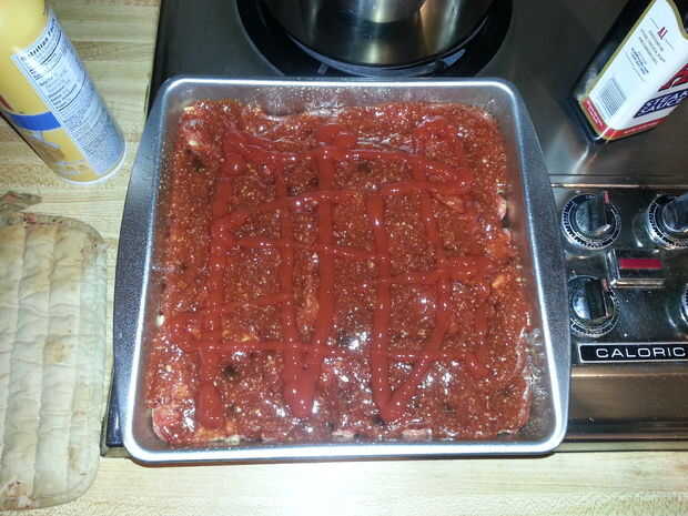 Mezclar todos estos juntos y extensión alrededor de la parte superior del pastel de carne. Si desea puede tomar Salsa de tomate y rociar en la parte superior como algunos tomatoey versión de salsa de chocolate. Realmente no añade nada al sabor, pero se ve cool.