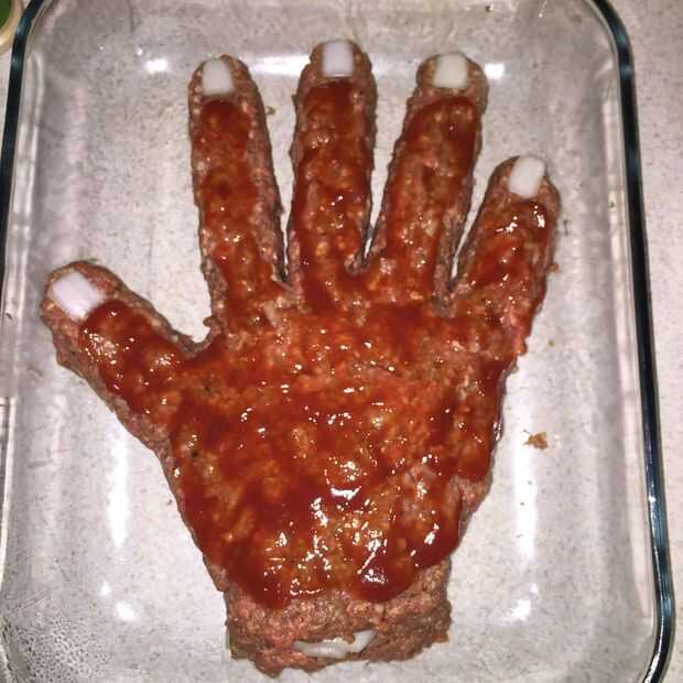 Primero forma una palma con la carne. Luego formar los dedos individuales. Asegúrese de que pegarlas bien por juntar la carne. Use la mano como referencia. ;)