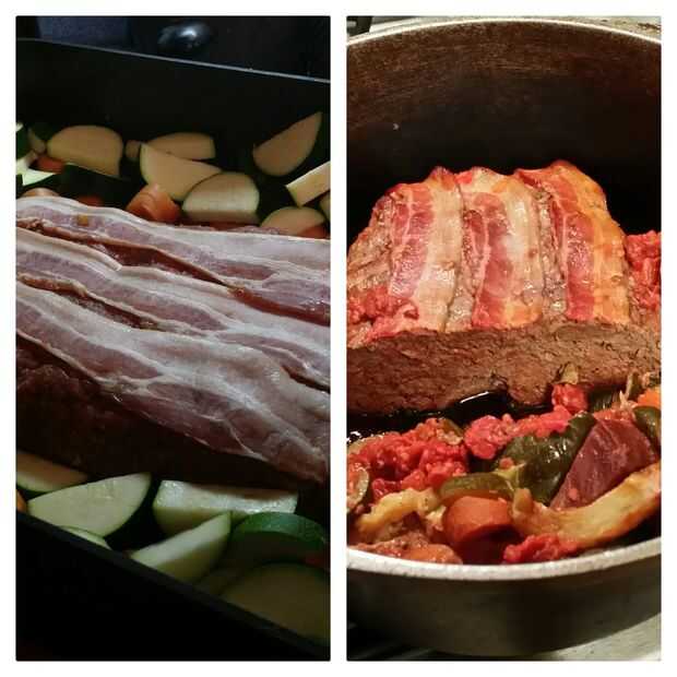 Poner en el horno sin cubrir durante 45 minutos, o cuando es que el tocino se dore bastante.