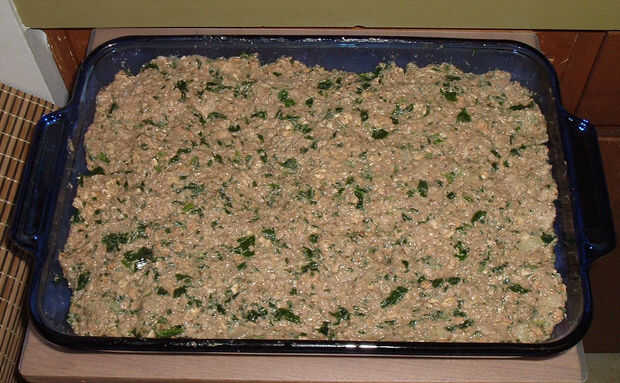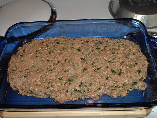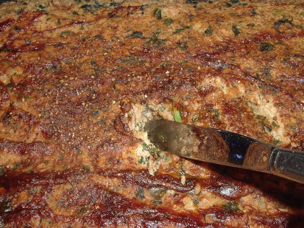 He incluido una foto de un pastel de carne más pequeña que hice para mostrar la forma aplanada que me gusta usar. Algunas personas prefieren moldear sus meatloafs (meatloaves?) mucho más como estándar barras de pan, a veces incluso los hornear en moldes de pan; pero creo que la forma de Cipsela (ciabatta-esque?) hace que para una cocina más rápido y más uniforme.