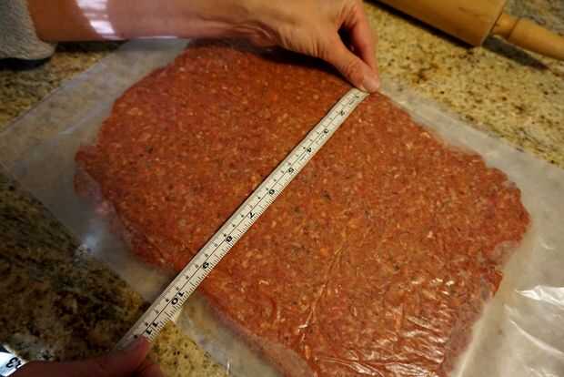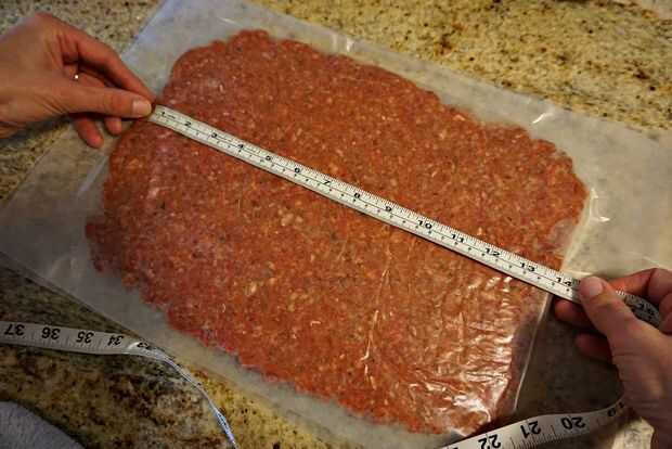 4. con el rodillo, rodillo de la mezcla de carne para que sea en un rectángulo de 9 por 13 pulgadas.