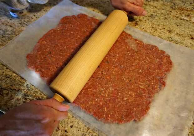 3. Coloque la segunda pieza de cera de papel encima de la mezcla de carne y alineado con la hoja inferior del papel de cera.