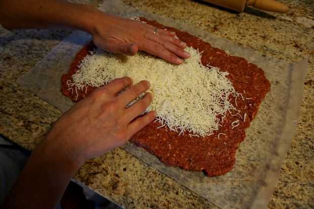 Tip: mantener el queso una pulgada lejos del borde de la mezcla de carne aplanada para que cuando usted rodarla en el siguiente paso es no un montón de derrame.