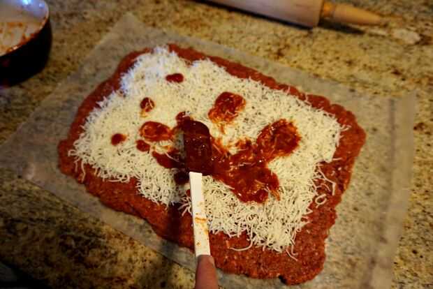 Una vez que la pieza de aplanado de mezcla de la carne, ahora está en el punto donde debe agregar la salsa de espagueti y mozzarella relleno.
