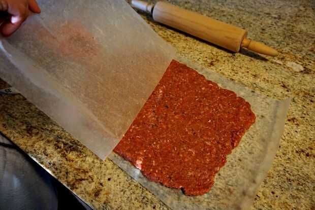 1. pelar la hoja superior de papel de cera de la pieza de aplanado de mezcla de carne y échalo de ti.