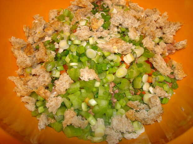Añadir todas las verduras reservando 1-2 cucharadas de apio, cebolla los pimientos para la guarnición.