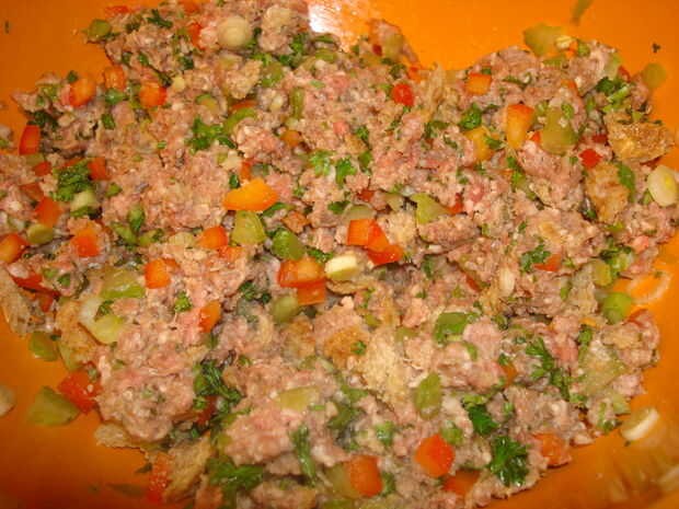 Cupcakes de pastel de carne hechos de una manera sencillaPaso 1: Mezclar los ingredientes Usé 1 y medio de libras de carne de hamburguesa1 gran Jalepeno1 pimiento amarillo3 huevosEspecias (eneldo, comino, Chile en polvo, ajo en polvo, perejil)SalPimi