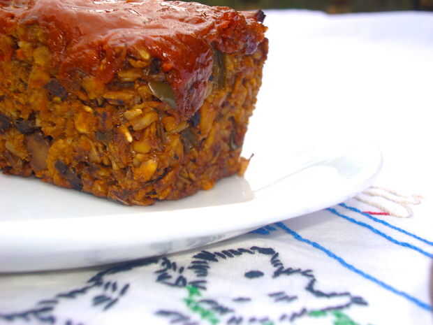 mi hija es vegetariana y su marido es un amante de la carne! ¡ Estoy visitándolos y han alterado mi receta favorita de pastel de carne para que sean ambos felices! Si tuviera que describir este pan de carne... Creo que podría llegar lejos con llamar a "Pastel de los amantes de la carne!" Lo digo porque.... el sabor y la textura es increíble y si no sabes los ingredientes creo que se podría confundir como pastel de carne real. Es parte de alimentos enteros tales como avena y arroz y trigo germinado, cebada, centeno, mijo y maíz, así como las tuercas y un montón de verduras frescas! Si usted está interesado en reducir el comer carnes rojas