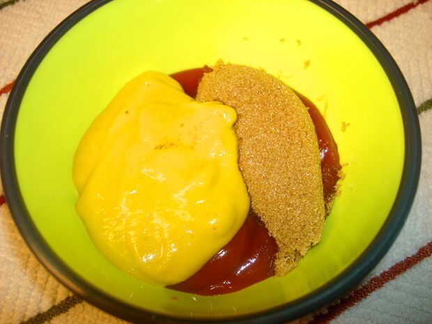 3/4 de taza de salsa de tomate y 2 cucharadas de azúcar morena 2 cucharadas de mostaza