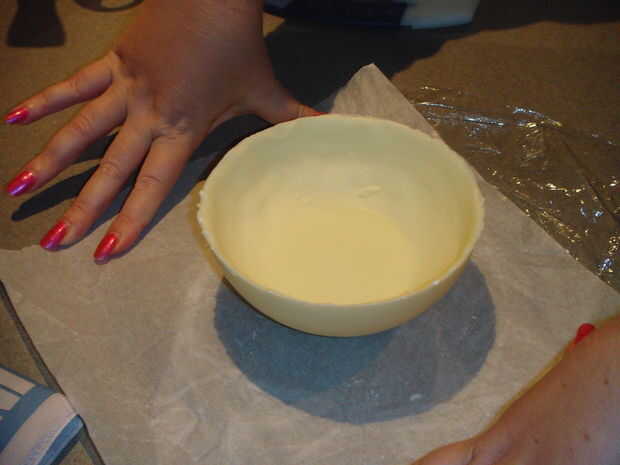Una vez que el chocolate se haya derretido verter algunos en el molde e incline y gire el molde para asegurarse de que todo está cubierto.