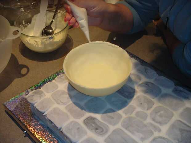 Luego utilizando una manga pastelera, tubo algunos cholcoate derretida alrededor del borde de la semiesfera inferior.