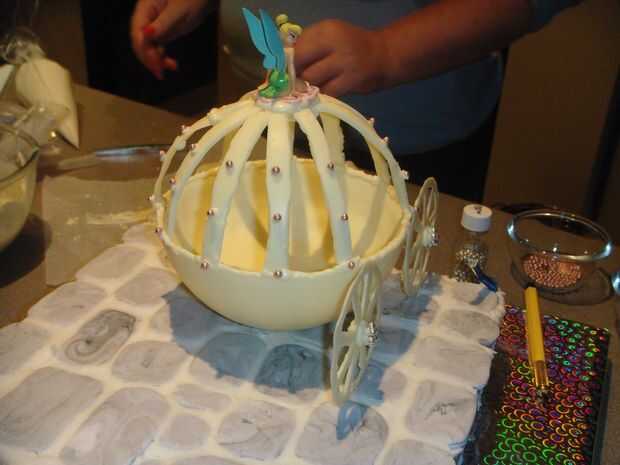 Para poner en orden la parte superior del carro, atamos una muñeca pequeña campanita que teníamos. Esto oculta donde las tiras de chocolate superpuestos unos a otros. Iban a añadir una corona de princesa pero pensaba la campanilla parecía más lindo.