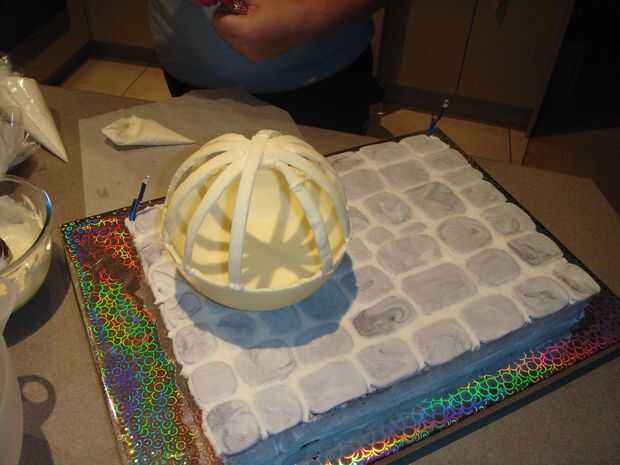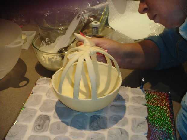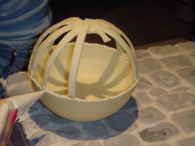 Con cuidado retire la mitad superior de la celosía y coloque sobre la bola más baja antes de los sistemas de tuberías de chocolate. Se necesitan dos personas para esto.
