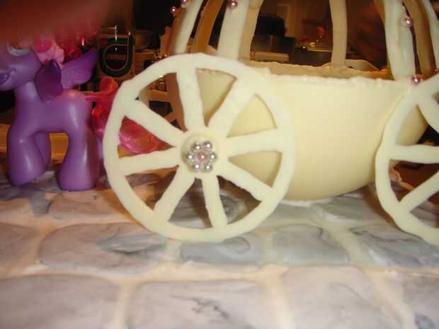 Una vez que esto ha creado trabajo entonces donde las ruedas va contra el cuerpo y luego poner chocolate derretido en la parte posterior de las ruedas donde toca el cuerpo. también colocar un chocolate fundido donde la rueda toca el pastel. Vuelva a colocar la rueda en su lugar y mantenga durante unos segundos el chocolate derretido establecer y mantener la rueda su propio.