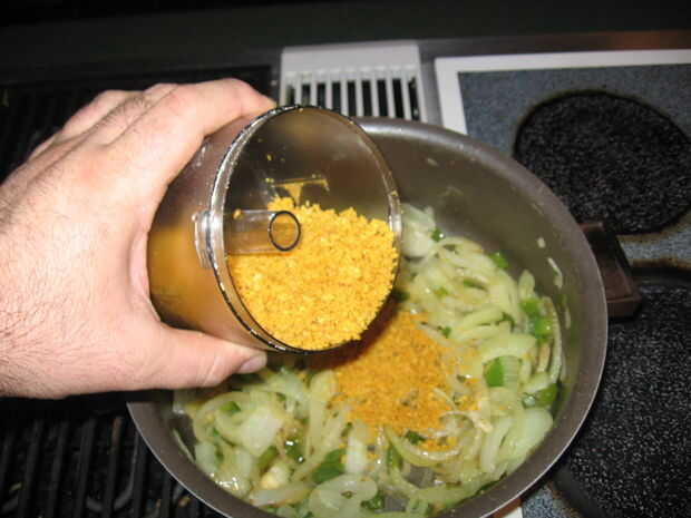 Paso 10: Añadir las migas de Dorito a la mezcla de cebolla y pimiento
