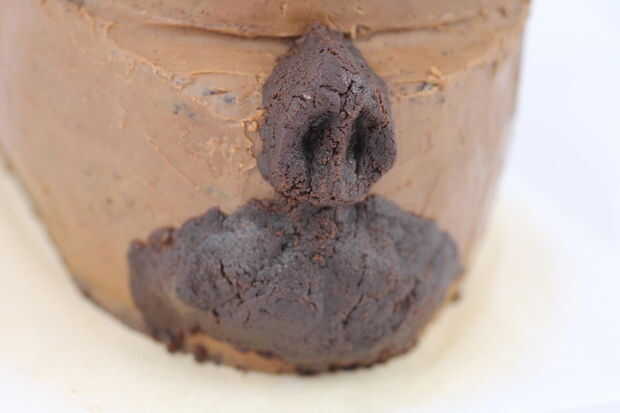 Tomar un trozo de trufa alrededor de un par de cucharaditas y presiona en el frente de la torta para hacer una nariz. Usando la forma de su alcance en una nariz con nariz. #