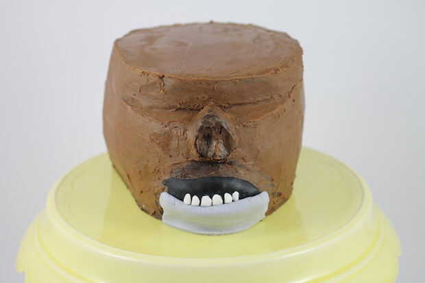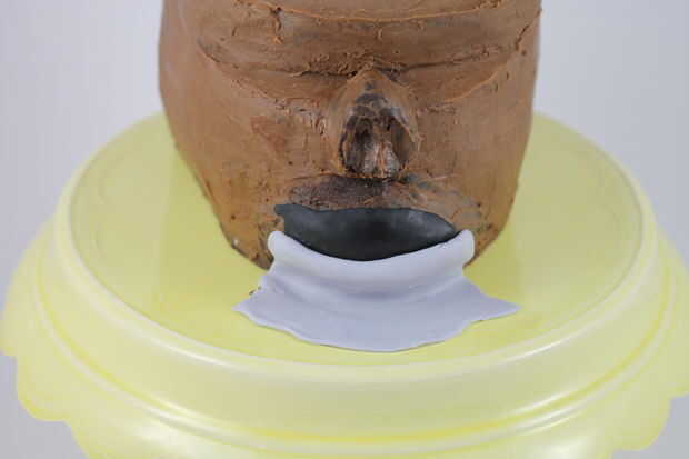 Presiónela en su lugar bajo el área de la barbilla y con un cuchillo afilado recorte cualquier exceso. Utilice el pastel decoración herramienta para marcar sangrías a lo largo de la zona del labio como pliegues en la piel.