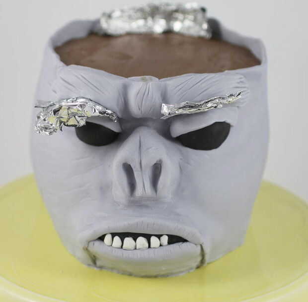 Coloqué un papel en un par de puntos para el fondant mientras se secaba. Presione el pastillaje (fondant) en las áreas de zócalo del ojo y alrededor de la boca, dejando bastante negro para los dientes a ser insertado más adelante. Asegúrese de que el fondant cubre la parte inferior de la torta de manera uniforme y no ganache está mostrando. Pulse en la zona de la nariz, usando el pastel decoración herramienta Presione las fosas nasales hasta que estés satisfecho con la forma. Añadir una sangría con la parte posterior de la herramienta de la torta en el centro de la nariz. La mezcla de trufa por debajo debe tener elasticidad un poco en esta etapa y todavía te puedes mover alrededor un poco para obtener su forma deseada.