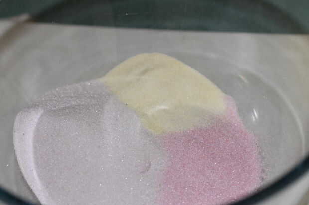 Vierta 2 paquetes de gelatina - gelatina (yo usé una uva y uno frambuesa) en un recipiente grande con 3 cucharaditas de gelatina en polvo.